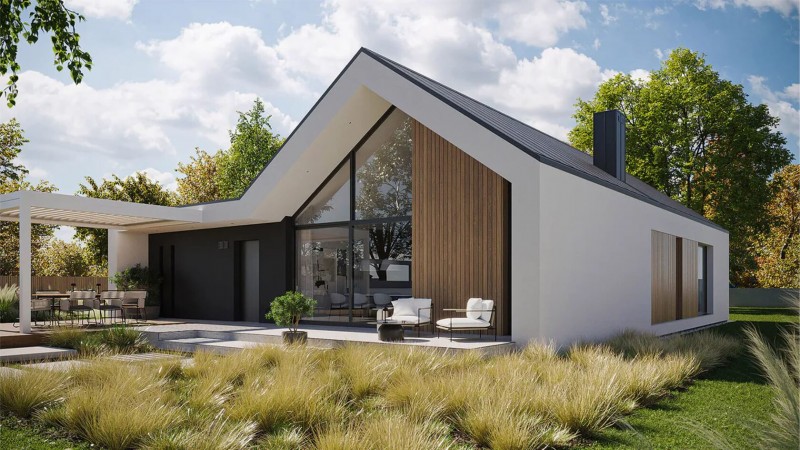 Гараж на одно авто и котельная с функцией кладовой запроектированы под плоскую кровлю. Основной жилой блок с двухскатной кровлей. Две детские, ванная и мастер-спальня с гардеробной расположены вдали от просторной кухни-гостиной, которую освещается высокий витраж со вторым светом.