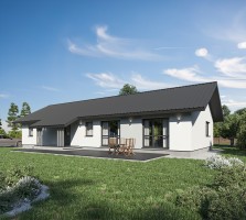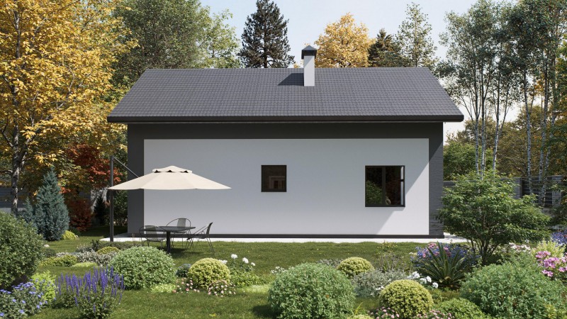 Одноэтажный дом с двускатной крышей, представляет собой классический вариант загородного дома. Двускатная крыша гармонично сочетается с окружающим ландшафтом.