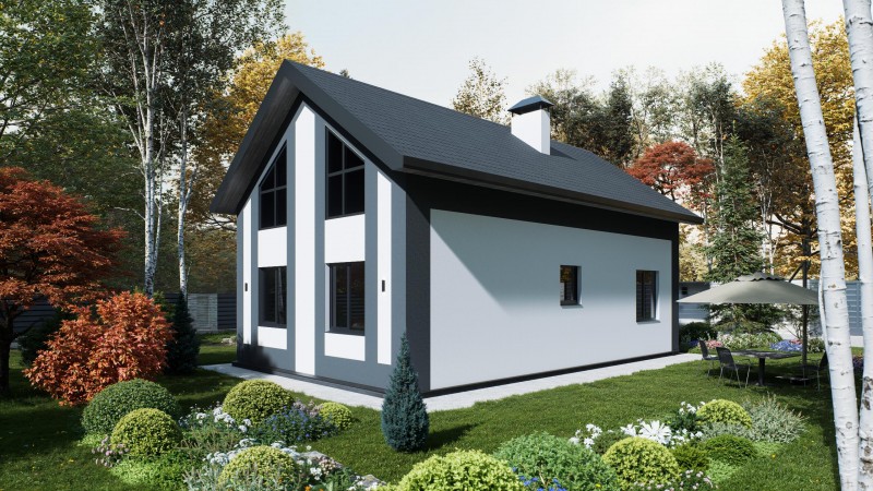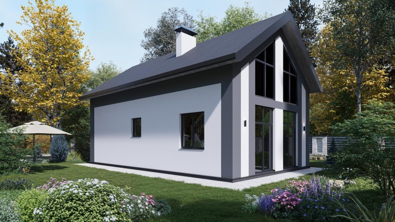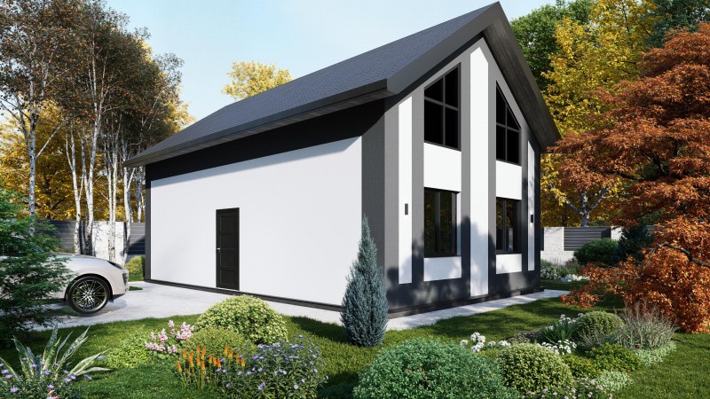Объемо-планировочные решения дома вмещают просторную кухню-гостиную с большими панорамными окнами второй свет, мастер-спальню на первом этаже, санузел и прихожую. На втором этаже общее пространство с возможностью расположить две спальни и ванную.