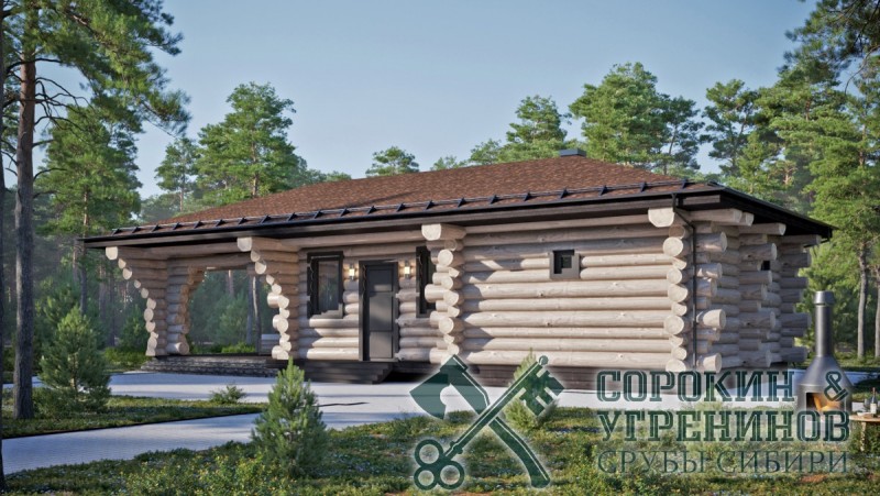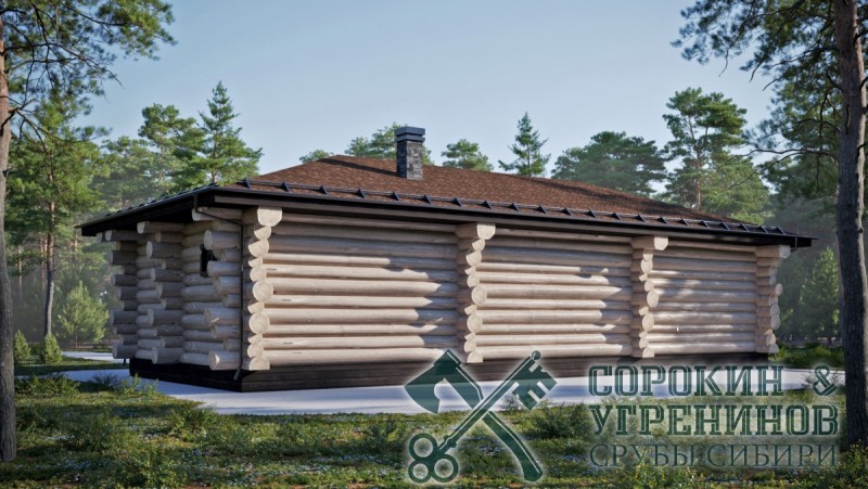 Сруб бани рубленый из бревна кедра диаметра 360мм площадью 75,8м2. Размер сруба 6,2х15,5 метров по осям. Баня имеет большую террасу, парная и мойка раздельные, есть комната отдыха и санузел. Сруб рубленый вручную в русскую чашу (охлоп), брёвна окоренные гидро-окоркой (водой под высоким давлением), а так, же это можно сделать скобелем или лопатой, или строганное рубанком. Объем бревна в срубе 92м3.